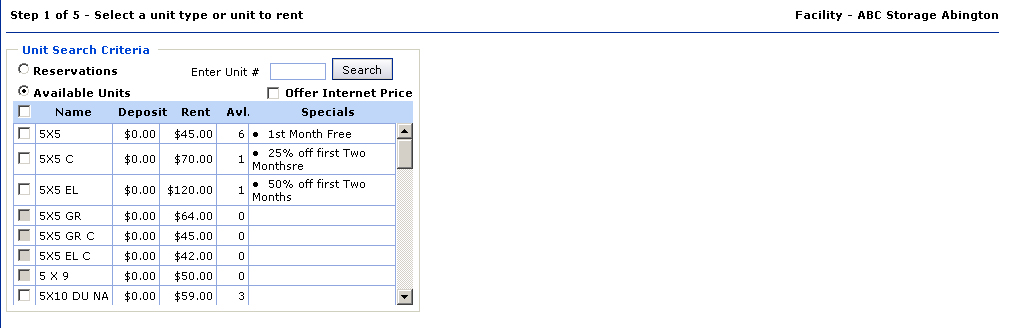 The Rent / Reserve page is where you enter new rentals (move-ins), enter new reservations, and look up existing reservations, by selecting the appropriate option in the top, left corner of the screen.